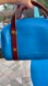 Stylish blue leather handbag featuring elegant brown accents. Perfect for any occasion.