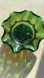 Elegant green glass bowl perfect for adding a touch of sophistication to your home decor. The intricate design enhances its beauty, making it a standout piece. This beautiful iridescent carnival glass bowl. Please see pictures two very small chip imperfections on the bottom of glass and one imperfection on the inner rim. Item is priced accordingly.
