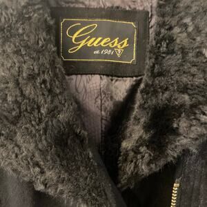 Small Black Guess coat with faux fur collar and wrist. Zips up the side. Dry clean only. Mid length coat is in Excellent condition. The inside is lined. The body is a wool like blend and the arms are suede like material. 2 front pockets. SUPER CUTE.