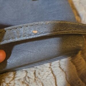Approximately 6" x 9"; Removable, adjustable strap with many zippered compartments with gold-toned hardware. Imitation leather. The bag is unused but does have some scratches on the strap. Very cute & versatile!
