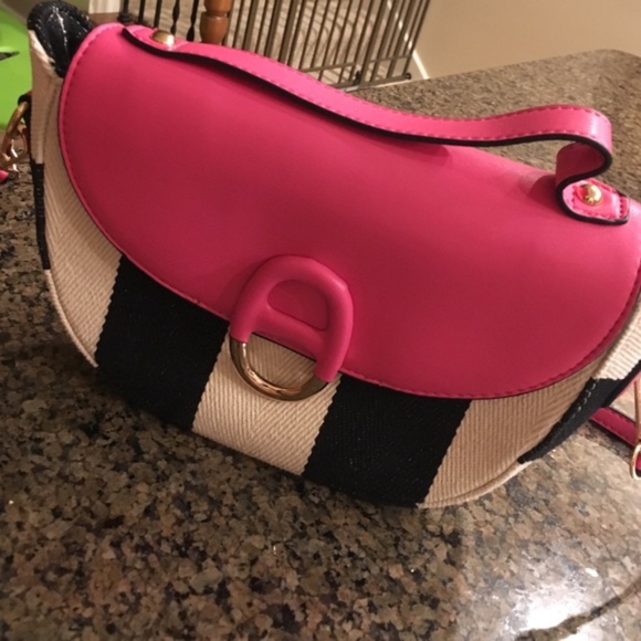 Perfectly adorable striped bag! Pink faux leather flap top with matching straps. Black and white striped fabric body. Zipper and phone pockets inside. Zip and button closure.