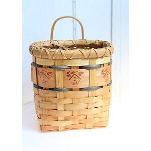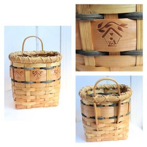 Basket is light brown in color with a birdhouse design around the top. It also has a hook for haning, plus, a country blue/gray accent around the birdhouse design.