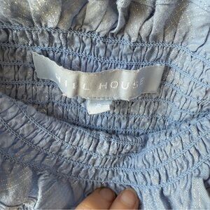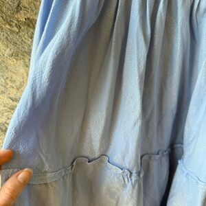 Chic blue dress with subtle shimmer. Features elegant ruching.