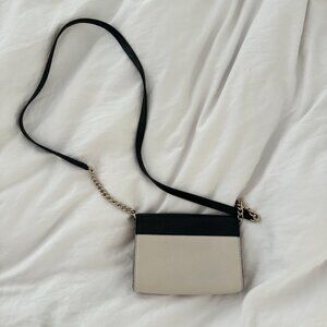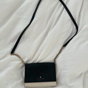 Small Kate Spade crossbody bag with black flap on a cream base. Kate Spade lettering is fading a little, and there is light wear on the strap. Small pocket inside. SIZE: 6.5X5X1.