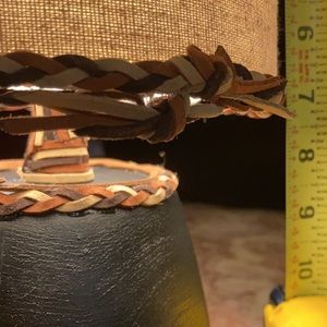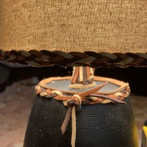 Brand new Light beige linen look . Lampshade detailed with braided leather top and bottom Approx 13.5 “ tall 7 “ wide. 40 watt Handmade