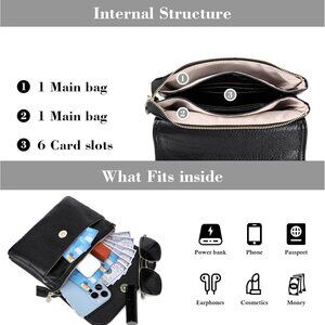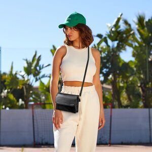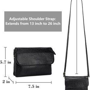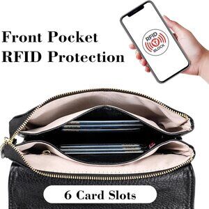 Features: Compact yet efficient crossbody with a soft faux leather exterior and durable hardware. It measures 5.7 inches high, 7.5 inches long, and 2 inches wide, with an adjustable strap from 13 to 26 inches. It includes 6 RFID-shielded card slots to keep your contactless info safe, plus multiple pockets—front slip pockets for quick access, a main zip compartment, and a discrete back zip pocket—ideal for keeping essentials organized.