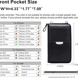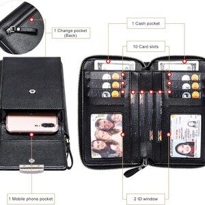 Features: Made from smooth leather, this compact crossbody is perfect for carrying your phone (under 6.5 inches screen) along with cards, cash, and a few small essentials. The upgraded zipper adds peace of mind and security. It has multiple compartments — from credit card slots to a main pocket, plus a front phone pocket and clear ID window — making organization effortless. The adjustable strap makes it comfy for everyday errands, travel, or casual outings.