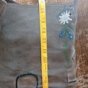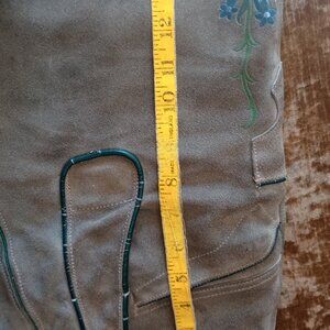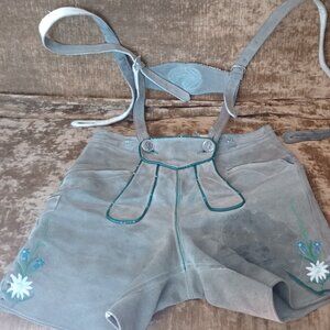 Perfect for October Fest or Halloween. Small pair of sage green leather lederhosen. Well loved, clean, needs two buttons to attach suspenders inside of the back