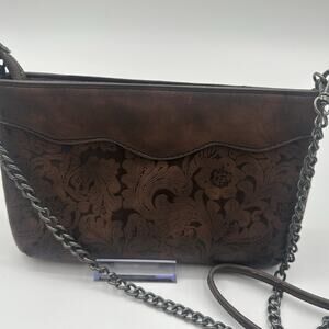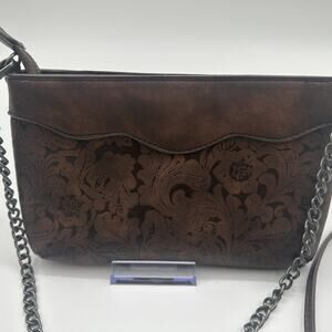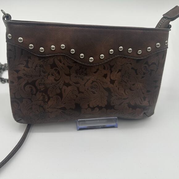 Cute little western style tooled crossbody with silver studs on front. Zippered top with chain strap. One inside zippered pocket.