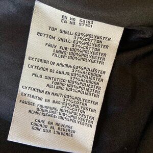 Design details include a full button-front closure, two snap-closure chest pockets, and two large lower hand pockets for practical storage. The durable shell is a blend of 63% Polyester and 37% Cotton, while the faux fur collar, lining, and filler are all 100% Polyester.
