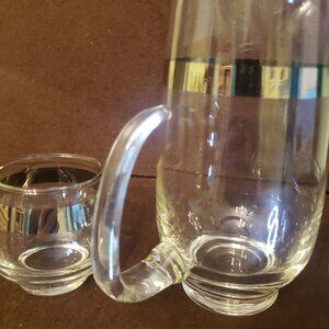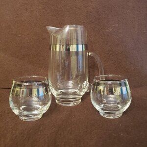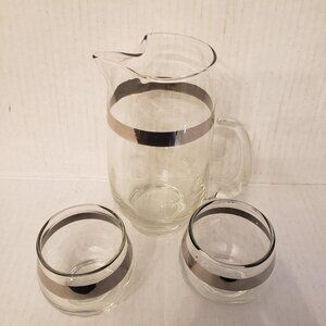 Small Libbey Mid Century Silver Stripe Glass Pitcher With 2 Glasses