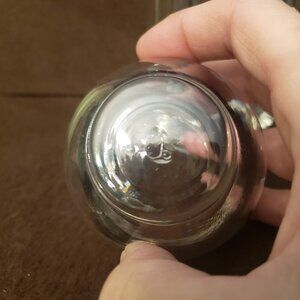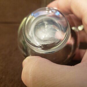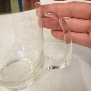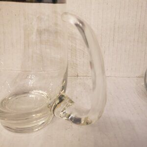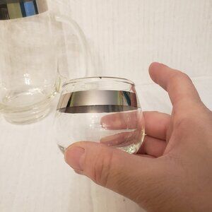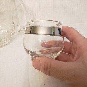 This small pitcher looks hand blown, holds about 16 ounces, comes with two glasses with matching silver stripe, glasses have Libbey "L" and hold 4 ounces.