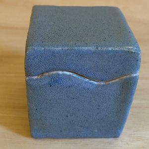 This is a small studio pottery glazed ceramic simple jewelry gift trinket box with lid and is signed Moe Denman I. It is light blue gray in color with a shiny glaze both inside and out. The lid and box have been cut to fit together similar to puzzle pieces. Would be a great piece to store jewelry or other small items on your bedroom dresser. It also would make a lovely gift box for a piece of jewelry. It is in good condition, please see pictures for details.