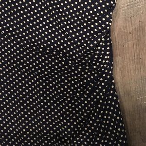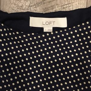Small Loft dress with a gathered left waist (very flattering!). Navy with tan polka dots, fun but also office appropriate!