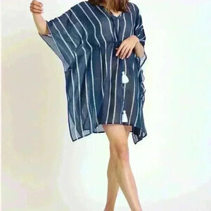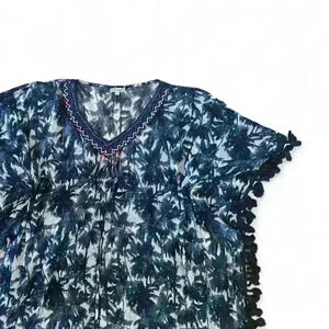 This Bohemian Blue Palms Print Kaftan is bohemian and playful at the same time. Perfect for all body types! The loose and cool design gives the freedom of coverage while maintaining an inner shape through the darts around the waist and arms that shows off the body in a flattering way. The fabric is cool and light making it a perfect cover-up while at the beach, pool or even while dining at a local lunch spot in between your lounge chair! The details on this Kaftan are delightful from the beads to the tassels! This is a great deal considering quality, brand and of course the original price of $89.