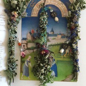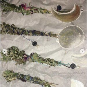 Herbal wand of natural botanicals grown by me. These are moon themed for rest, relaxation, soothing, calm, and imagination. Mint and lavender with some lemon balm, mugwort, and snapdragons as well. Handmade semiprecious gemstone and pearl charms. Silk thread. Each is unique. Limited edition. Please be careful- do not leave unattended or use if allergic. Not to be ingested in any way. Also beautiful as decor or a gift. Thank you