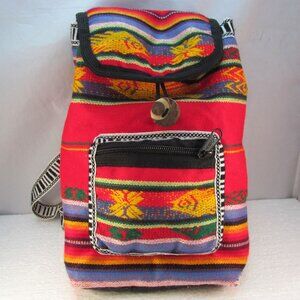 Small multicolored striped lightweight fabric backpack.