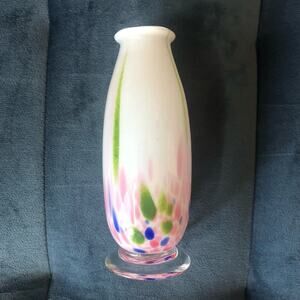 Murano Inspired Vase - small, handblown glass vase Made in Japan. Tulip shaped, mostly white with sparkly green, pink & blue.