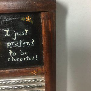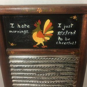 Small Vintage Wood & Metal Washboard with hand painted country folksy motif of a rooster/chicken with the saying: " I hate mornings. I just pretend to be cheerful!"