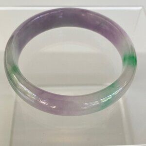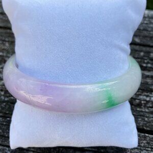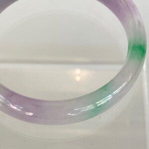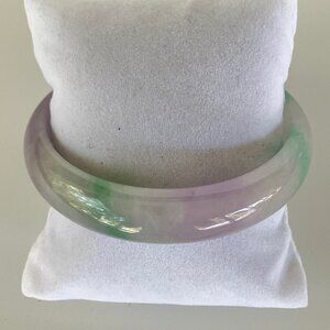 Vintage Small Pale Lavender Jade Domed Bangle Bracelet. Beautiful hues of light jadeite green with translucent white and lavender mottling. Fits a smaller wrist. 1/2" wide. 2 1/4" across the middle. Vintage condition. Shows wear, I can feel a scratch on the interior and exterior. See all photos