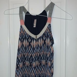 Blue, pink and white patterned tank with lace and buttons at the top, with solid blue back