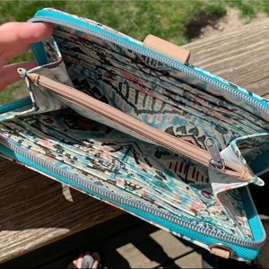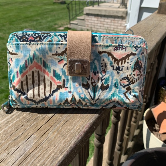 Blue and multi colored wallet/purse. It comes with a long adjustable strap to make it a purse and a small one to make a wristlet