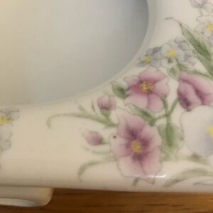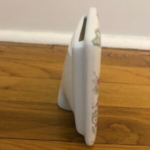 So sweet! This petite frame is white with pink and purplish/bluish flowers. Made of a breakable material, it features a slit at the top to drop the photo in. There’s no glass or plastic to cover the photo. Rectangular frame with oval photo opening. Fixed stand, doesn’t move or adjust so frame has to sit horizontally, can’t be turned on it’s side.