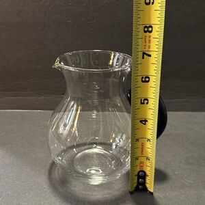 This small pitcher is clear glass with a blue glass handle. No cracks or chips. Comes from a clean, smoke free home. Fast shipper.