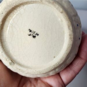 This hand-painted small pitcher or creamer from Japan is a beautiful addition to any kitchen. The blue flowers and dotted pattern are embossed onto the ceramic material, adding a unique and elegant touch to your serving set. The brand is unmarked, but the craftsmanship is clear in the intricate details of the piece.