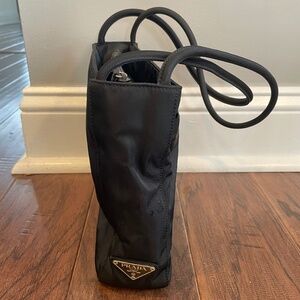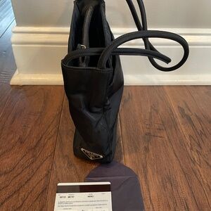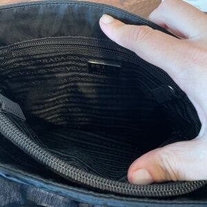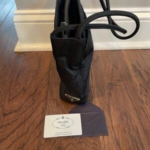 Like new, black nylon Prada shoulder bag. Rarely used and has certification card included. It has a zipper middle compartment and 2 open side compartment. It has a side Velcro compartment