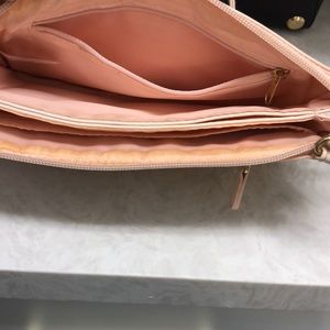 No brand name, never used small purse. Many zippers/pockets inside. Can be a king or short strap. Very light pink color