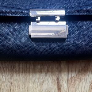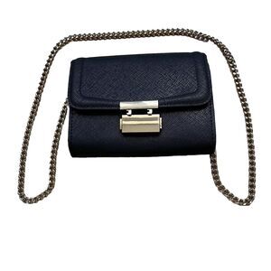 Small shoulder bag in grained faux leather. Metal buckle on flap, one inner pocket, and metal chain shoulder strap. Size 1 1/2 x 6 x 6 3/4 in.