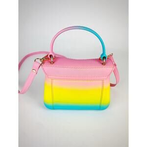 Adorable petite rubber rainbow colored jelly crossbody handbag with expandable sides, a removable crossbody strap, a top handle and a front locking clasp. Perfect for the girl on the go who only wants to bring her essentials, or remove the strap and give to a little girl who wants to just carry around a cute little purse to play with. Overall this is a great bag, with little signs of wear. Easy to clean with a single wipe, and lightweight as well. (PLEASE SEE PHOTOS!)