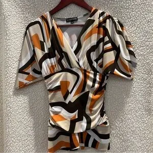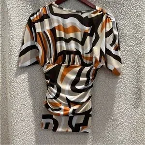 Small Rampage Top White, tan, orange and brown. Elastic on sides and shoulders for design and style. Gently worn. No damage.