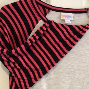 Super stretchy Small Randy!! Love the striped sleeve and detail around the neckline. Oatmeal body! Washed/worn