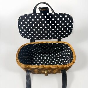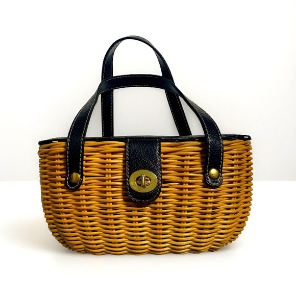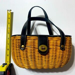 Cute, little wicker purse. Pre owned in great condition. Two small pockets on the inside, one has a zipper. Purse is 10in tall including straps.