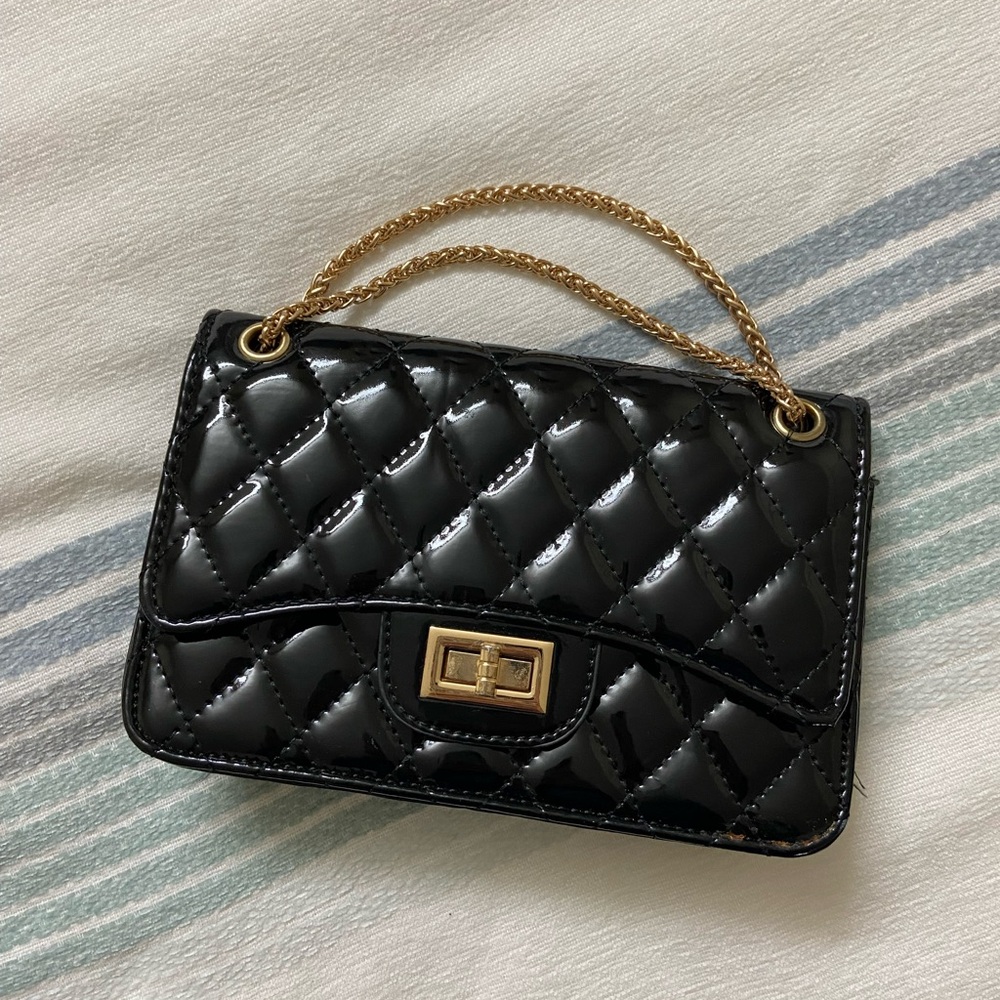 Used. What you see in the pictures is what you get. Faux black patent leather with a high-shine finish. Classic, quilted diamond pattern. Accented with gold-tone hardware. The inside is lined with black fabric and includes a small slip pocket for organization. Good for carrying small essentials like a phone or wallet. Can be used as a clutch or crossbody/shoulder bag.