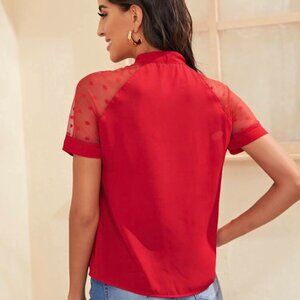 Small Red Hot Tie Neck Dobby Mesh w/ Dots on Sleeve Sexy Classy Top