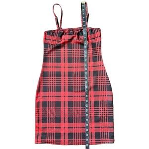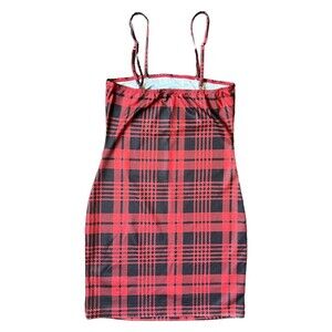 Red and Black plaid dress, size small, mini dress, form fitting and short with spaghetti straps and stretch.
