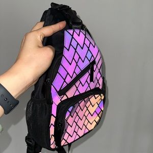 Only used once. Made of reflective material that “glows” under certain lights. Note that the bright photos are taken with flash. The bag looks dark purple and blue under regular light. Small compartments, safety buckle, straps that zip together, great for packing essentials for a rave or festival!