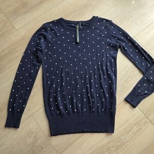 Renee C Jerri Polka Dot Cotton Blend Pullover 47% cotton / 53% acrylic deep, dark navy blue thin and breathable, lightweight crew neck sweater with bright white embroidered polka dot details. Ribbed cuffs and hem, tapered fit. Women's size SMALL, EUC. Can be worn as a sweater, over a button down dress shirt or loosely draped over the shoulders. Effortless chic.