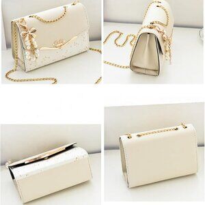 Elevate your accessory game with this stunning designer crossbody handbag featuring a sophisticated black and white color scheme. The distinctive speckled pattern on white creates a playful contrast against the sleek black leather-look material. Measuring 8.26 inches in length and 3.14 inches in height, this bag is perfectly sized for your essentials. The elegant gold-tone chain strap adds a touch of glamour, while the decorative bow charm adorned with pearls