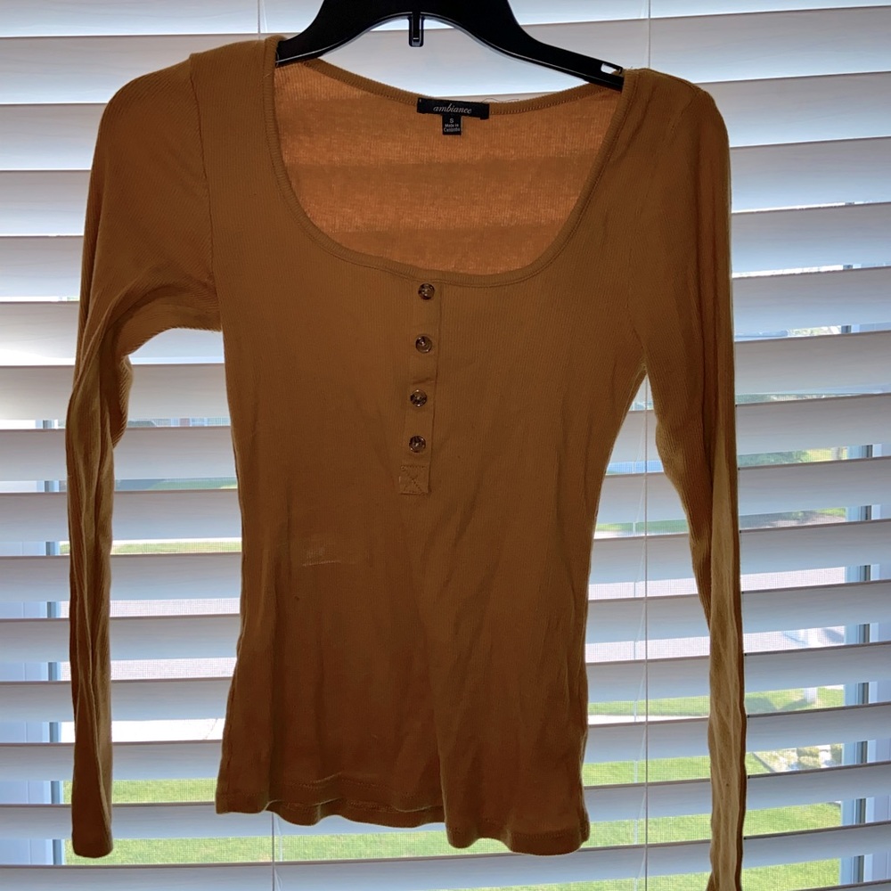 Lowcut Dusty Yellow ambiance Long-Sleeved top with brown buttons. Ribbed and fitted.