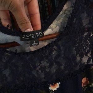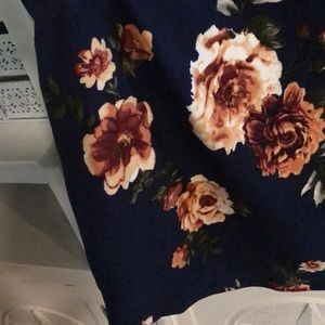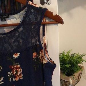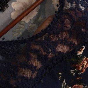 Navy colored blouse with floral pattern and lace. Lace can right about my chest. Shows more shoulder than anything. Very comfy top.