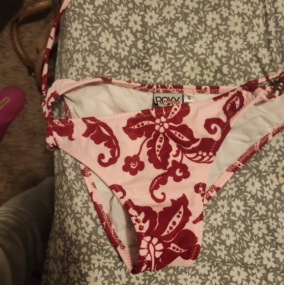 Small Pink Floral Hawaiian Print Bikini Bottoms with Rivits on strings. Some are missing off of one string but not noticeable. Can all be taken off if needed