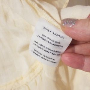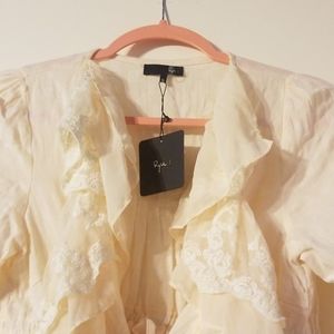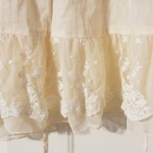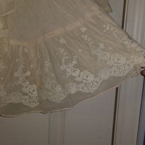 Cream bobo jacket with tie closure. 100% cotton. Cream fabric has a very subtle checkered pattern. Lace along edges and bottom of jacket. Drawstring tie closure with silver hardware. Really beautiful. I just bought the wrong size and they wouldn't let me return it.