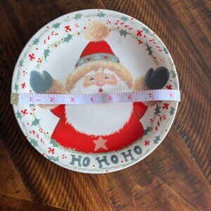 This small serving plate is perfect for your holiday meals. Featuring a festive design of Santa's ho ho ho, this plate is sure to bring a smile to your face and to your guests. Measuring 8 inches in diameter, it is the ideal size for serving small snacks or desserts. Crafted with care and attention to detail, this plate is a wonderful addition to your collection of holiday decor. Its multi-color design is vibrant and eye-catching, making it a great choice for display or for use during your celebrations. Whether you're a collector or just looking for a unique and fun piece, this small serving plate is sure to impress.