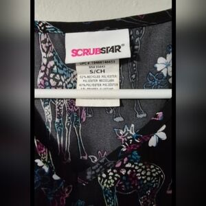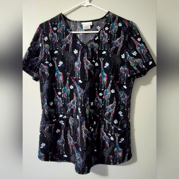 black scrub top with colorful giraffes, scrubstar size small great condition