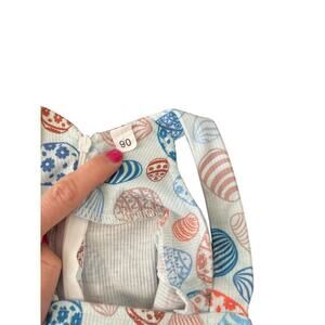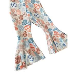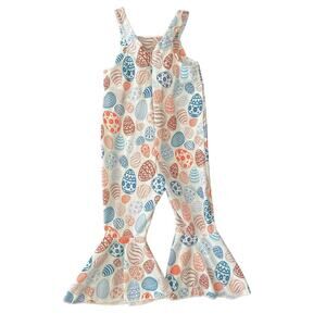 Add a little “flare” this #easter with this adorable blue ribbed jumpsuit. Features blue, brown, and orange Easter eggs with different patterns. Stretch ribbed cotton/polyester blend. Zip back closure. Pair with denim jacket if weather is cooler.