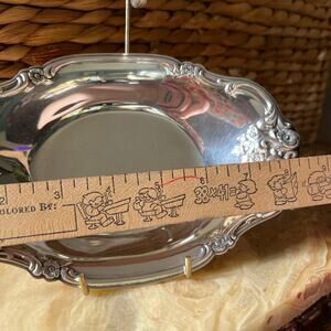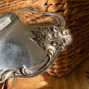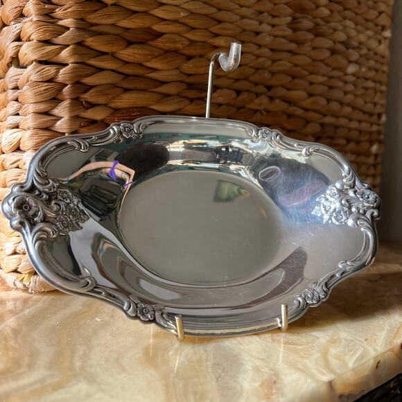 A small silver tray with floral textured edging. Show some surface level scratches from use and vintage condition, age, some tarnish as photographed. Please refer to all photos for current condition and measurements. International silver company stamp shown on bottom.